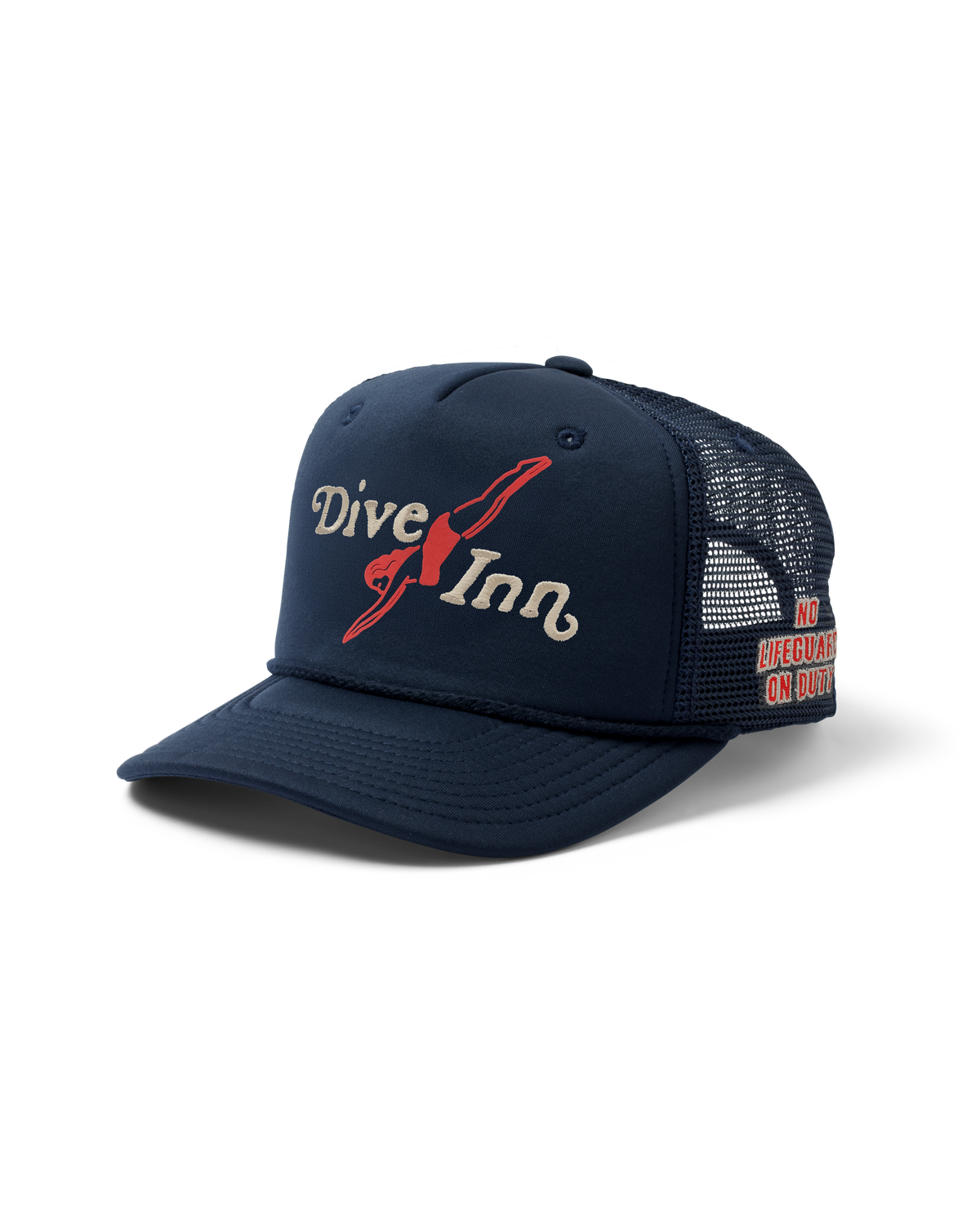The Dive Inn Foam Trucker Hat features a structured 5-panel design with a high crown profile and classic rope detail across the brim. Finished with “No Lifeguard On Duty” embroidered on the side and an adjustable snapback closure, it’s an easy, everyday trucker with a laid-back edge.