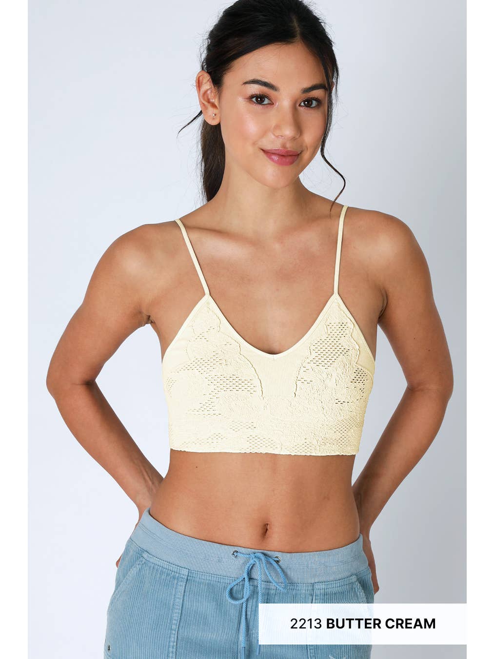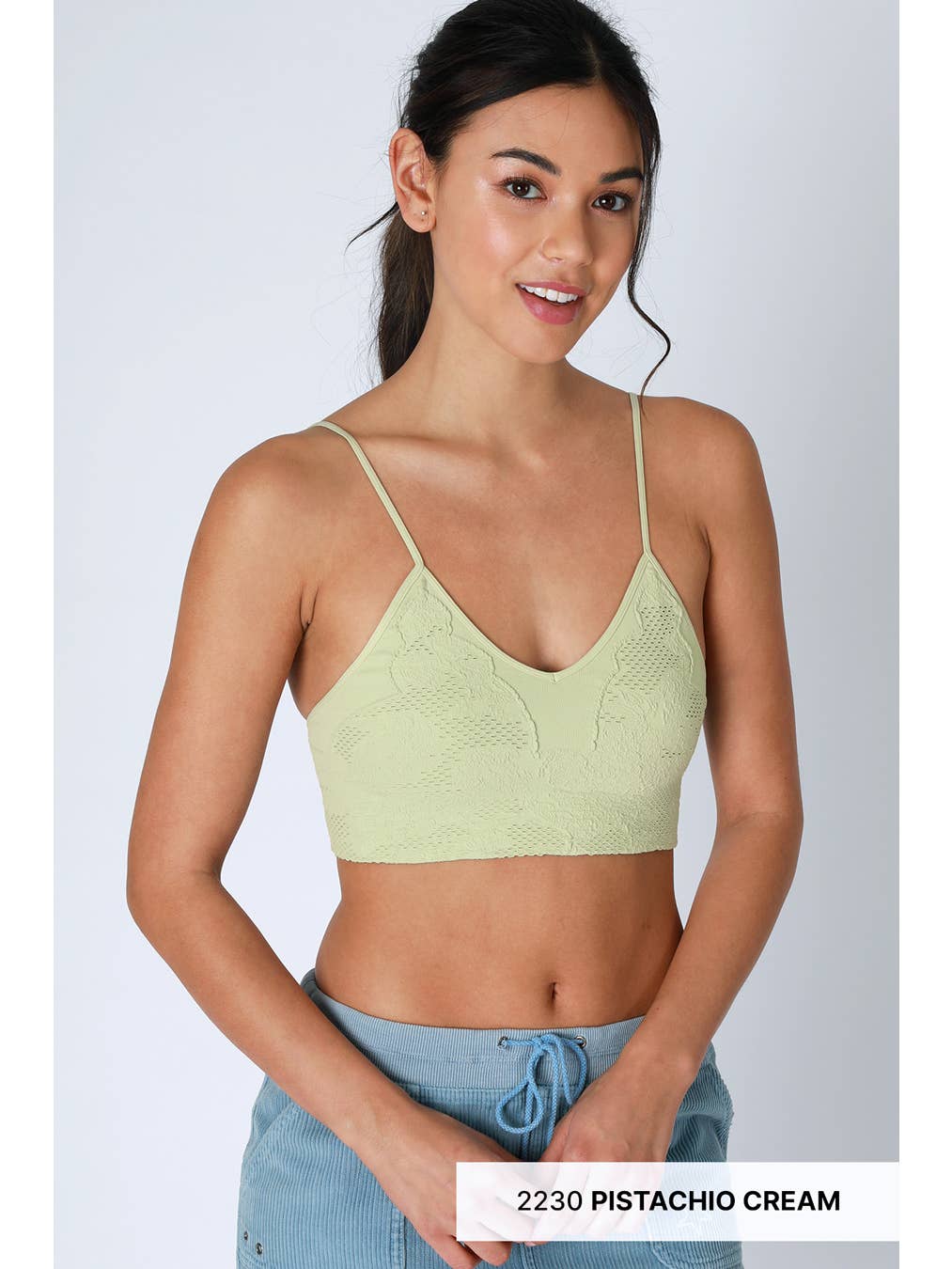 A seamless bralette featuring a floral lace design and a v-neckline.