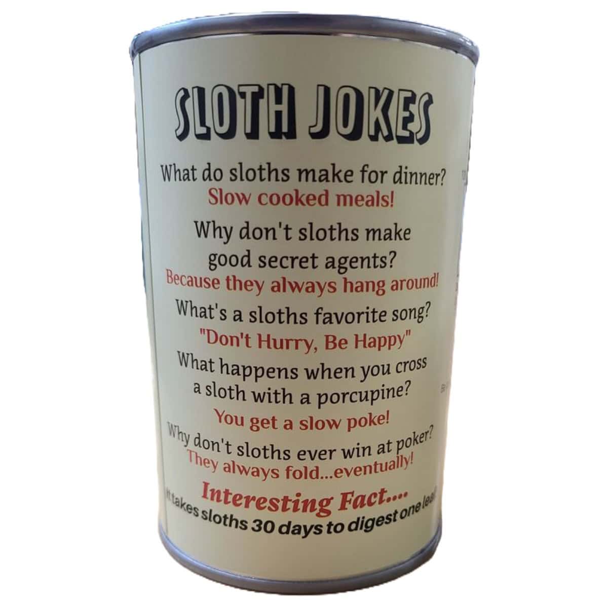 • Sloth plush sealed in a can• Plush measures approx. 5 inches each• Funny sloth jokes and an interesting fact on the can