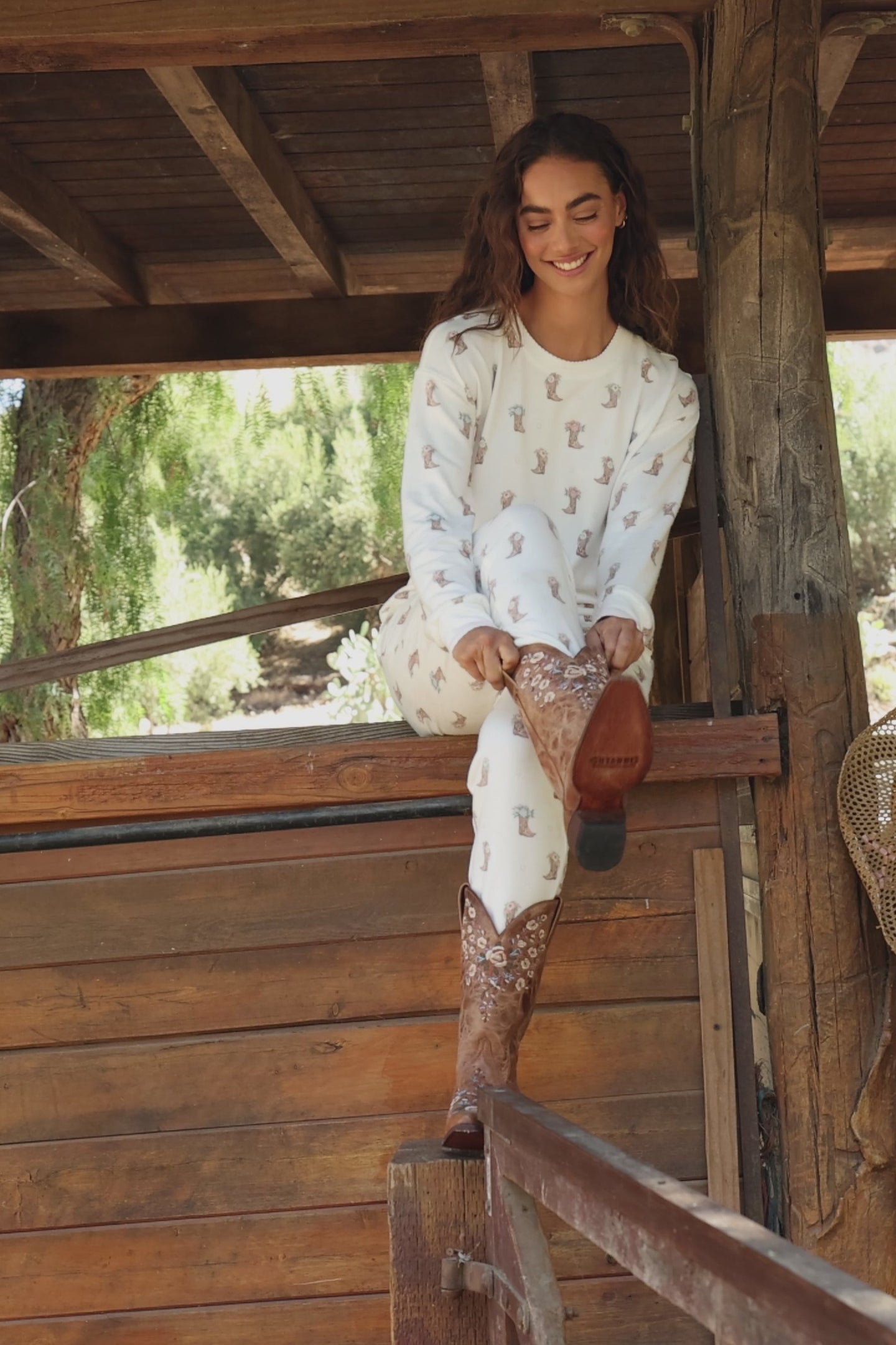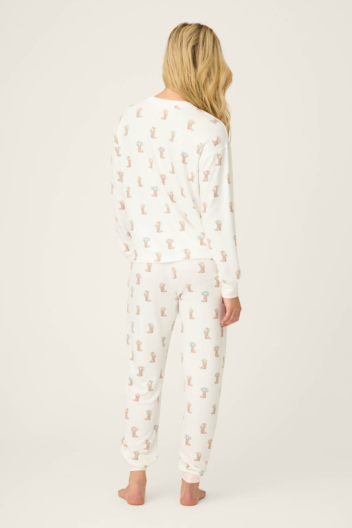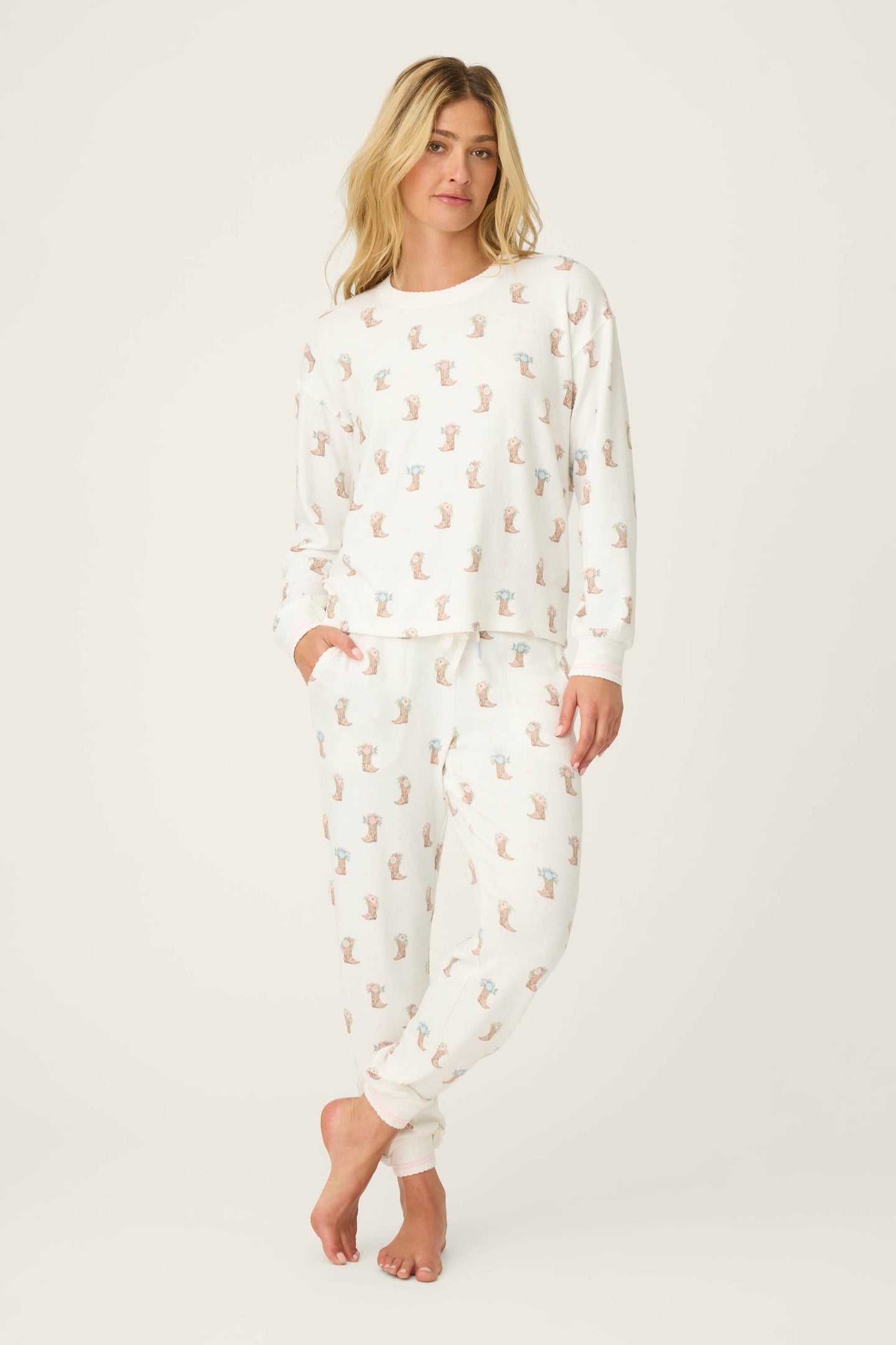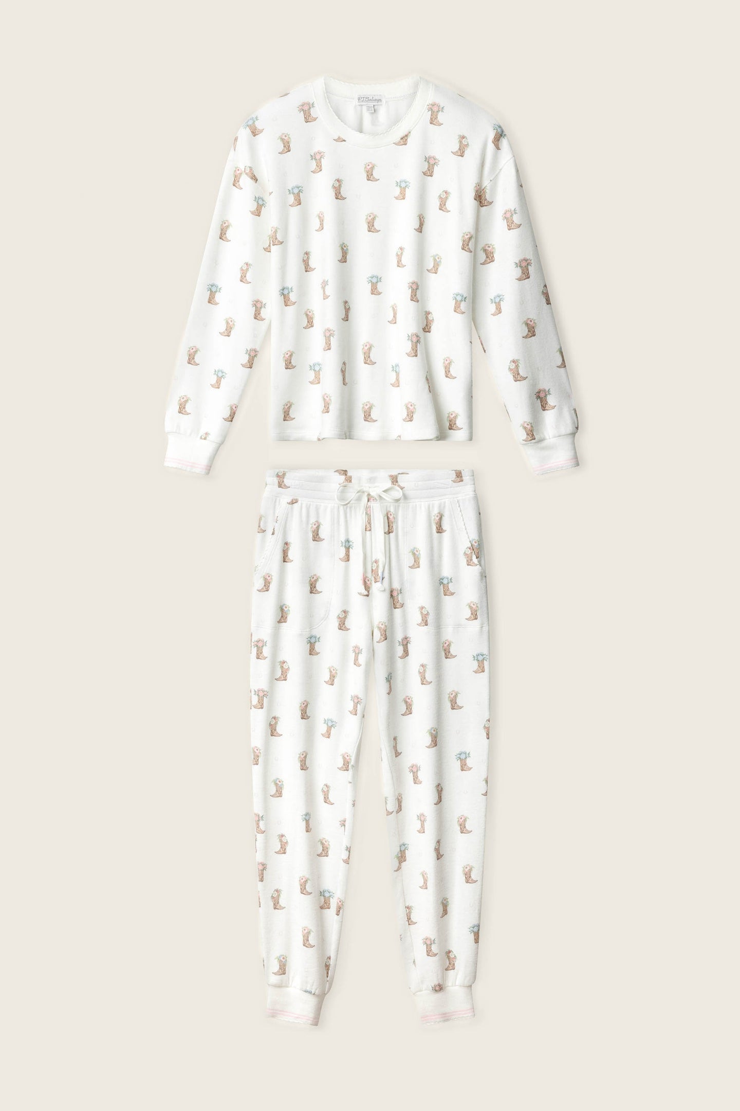 Saddle up for sweet dreams in these pj pants, crafted in peachy-soft jersey and sprinkled with illustrated cowboy boots topped with delicate floral details. These relaxed drawstring pants, finished with a comfy elastic waistband and scalloped trim for a soft, feminine touch. Made for slow mornings, lazy lounging, and kicking your boots off early.
