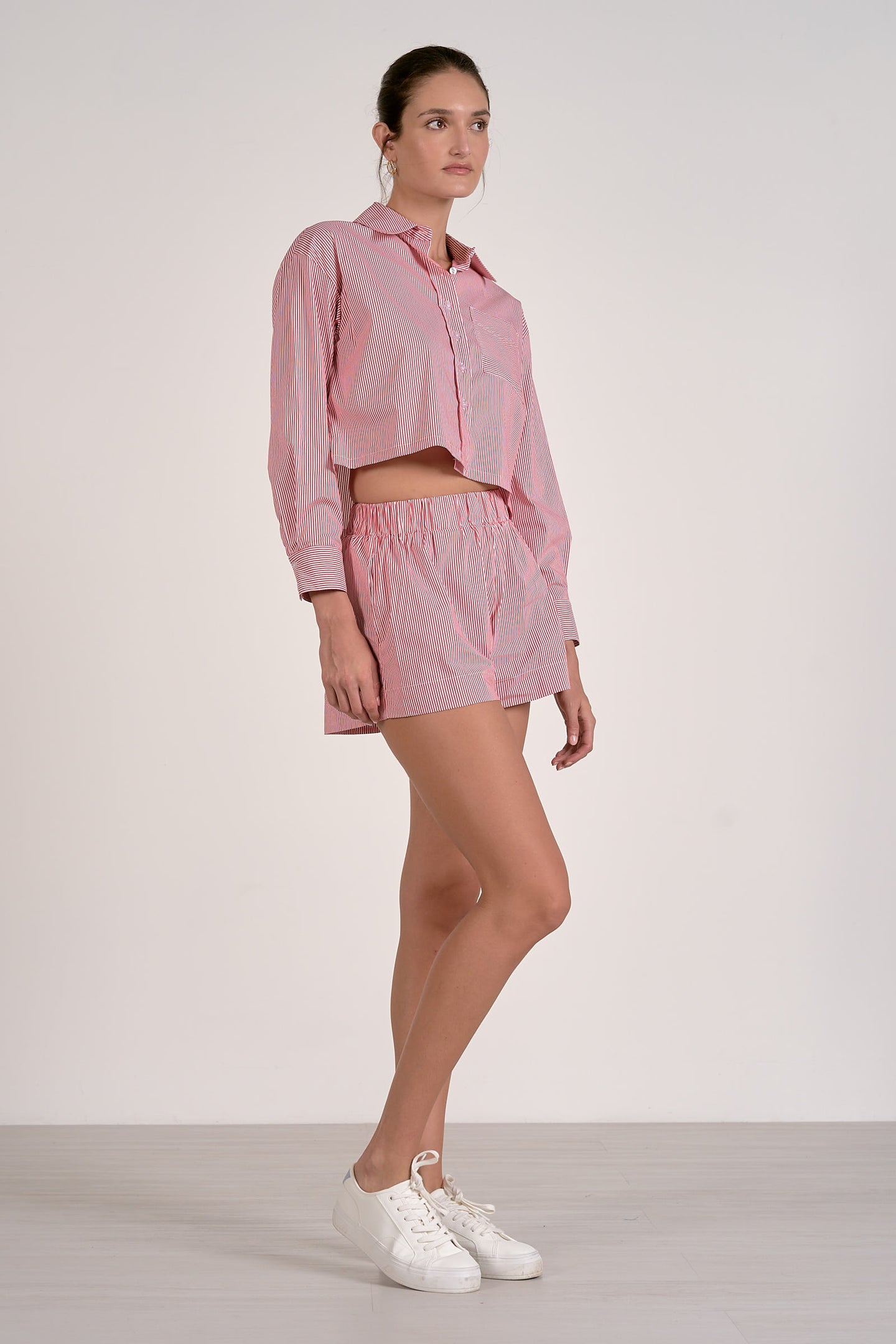 Part of a matching set, search for the red stripe button down.