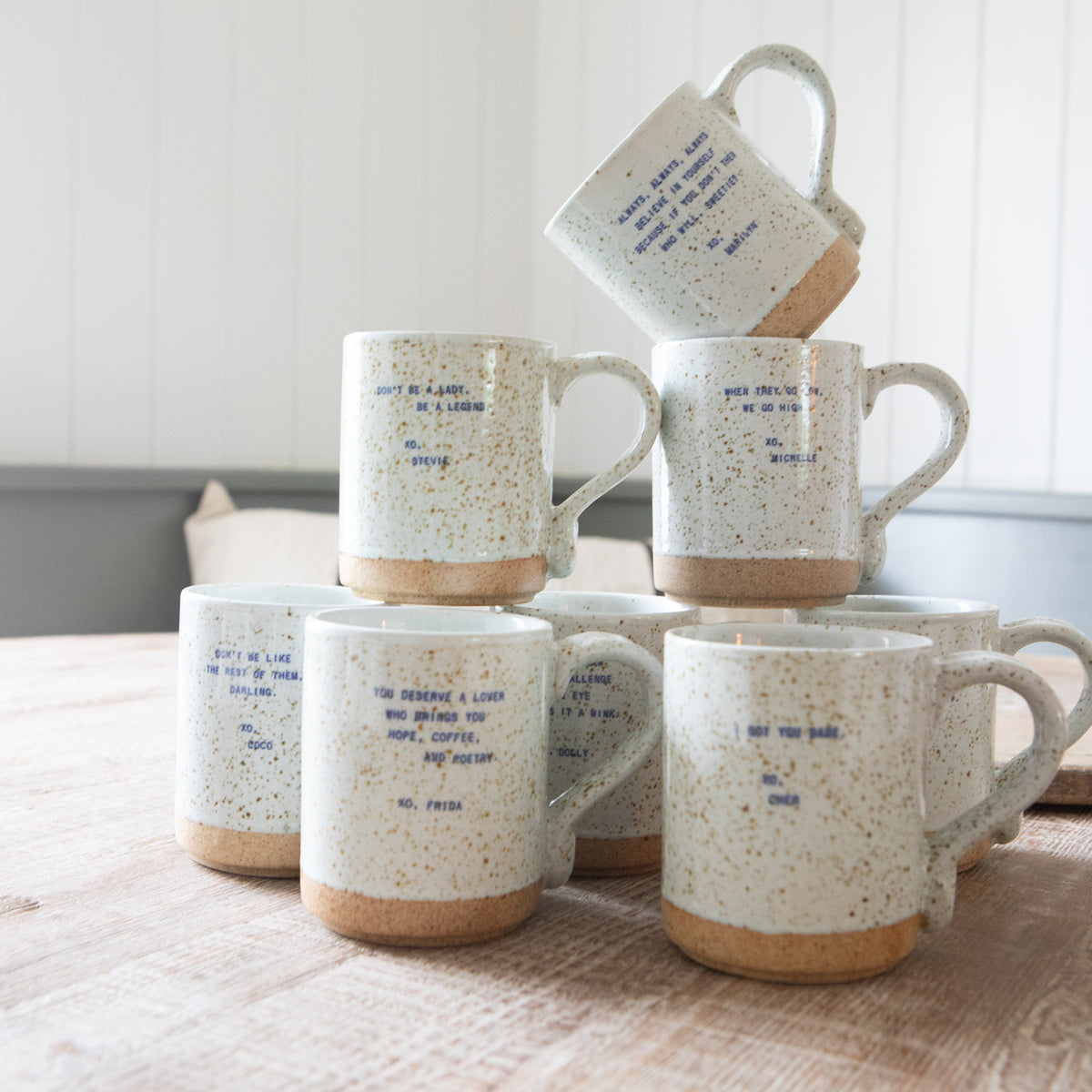 These oversized coffee mugs hold your favorite beverage while displaying inspirational quotes from your favorite "sheroes", celebrities, rockstars, or people in your life.